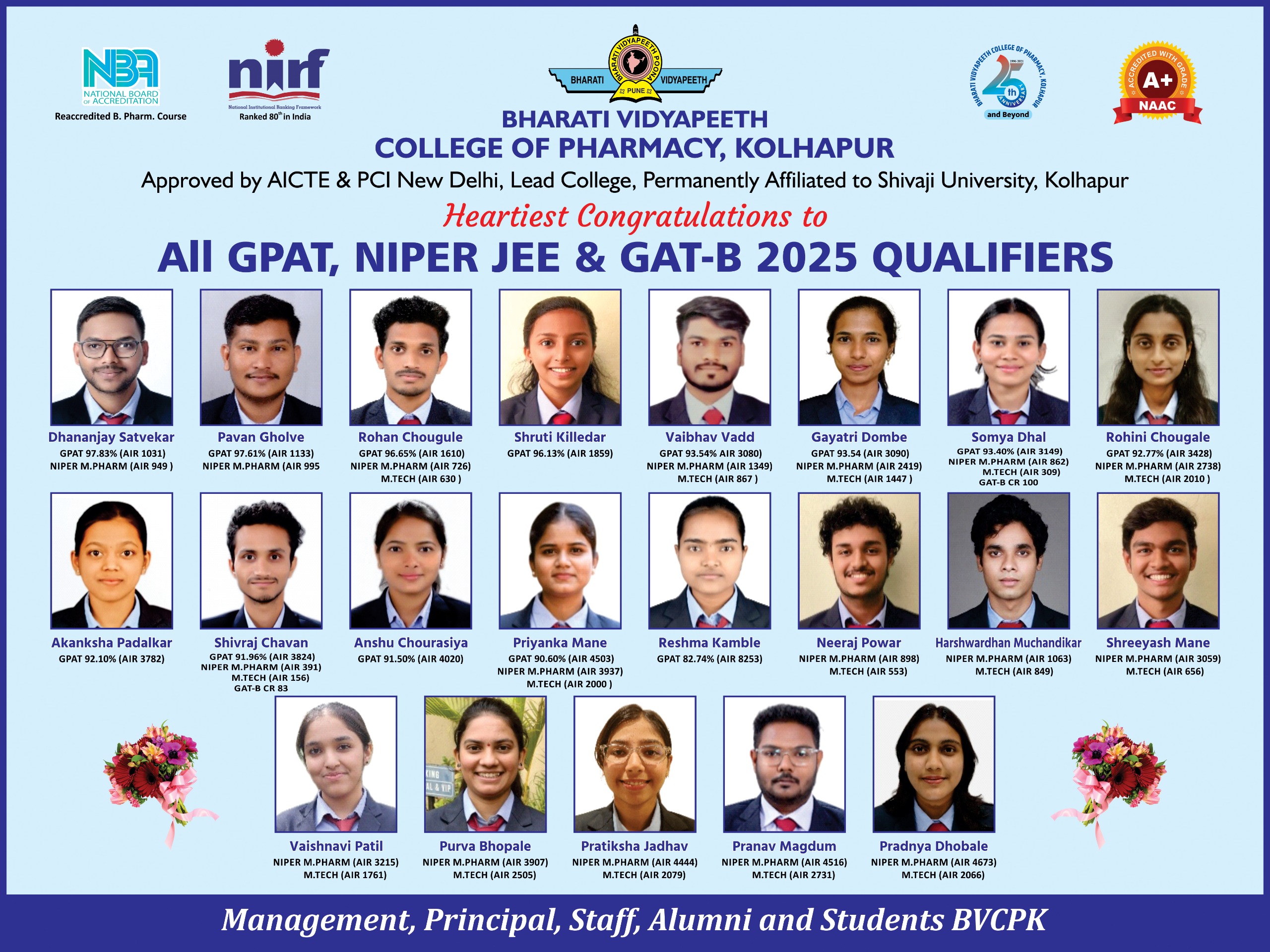 Bharati Vidyapeeth College of Pharmacy at Kolhapur was incepted in 1996 under the most potential leadership and vision of Honorable Dr. Patangrao Kadam, Founder of Bharati Vidyapeeth and also Founder and Chancellor of Bharati Vidyapeeth Deemed University,Pune. He foresighted the need for a good pharmacy institution in Kolhapur to cater the needs of the people in this district area and the adjoining Konkan belt.